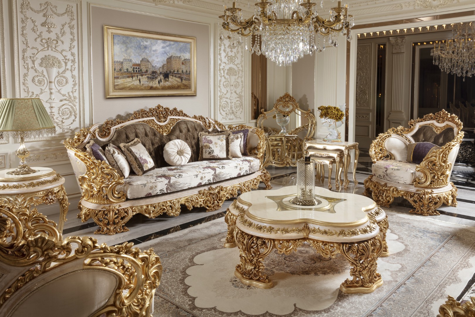 The MILAS Classic Dining Set with 8 Chairs, Console & Mirror is a magnificent expression of royal elegance and master craftsmanship. Designed for luxurious dining interiors, this exceptional collection showcases intricate hand-carved detailing, refined metallic accents, and rich classical finishes that elevate any formal space.