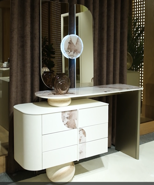 The matching console enhances the sophistication of the set, offering both decorative presence and practical surface space. The elegant framed mirrors complete the composition, reflecting light and amplifying the grandeur of the room.